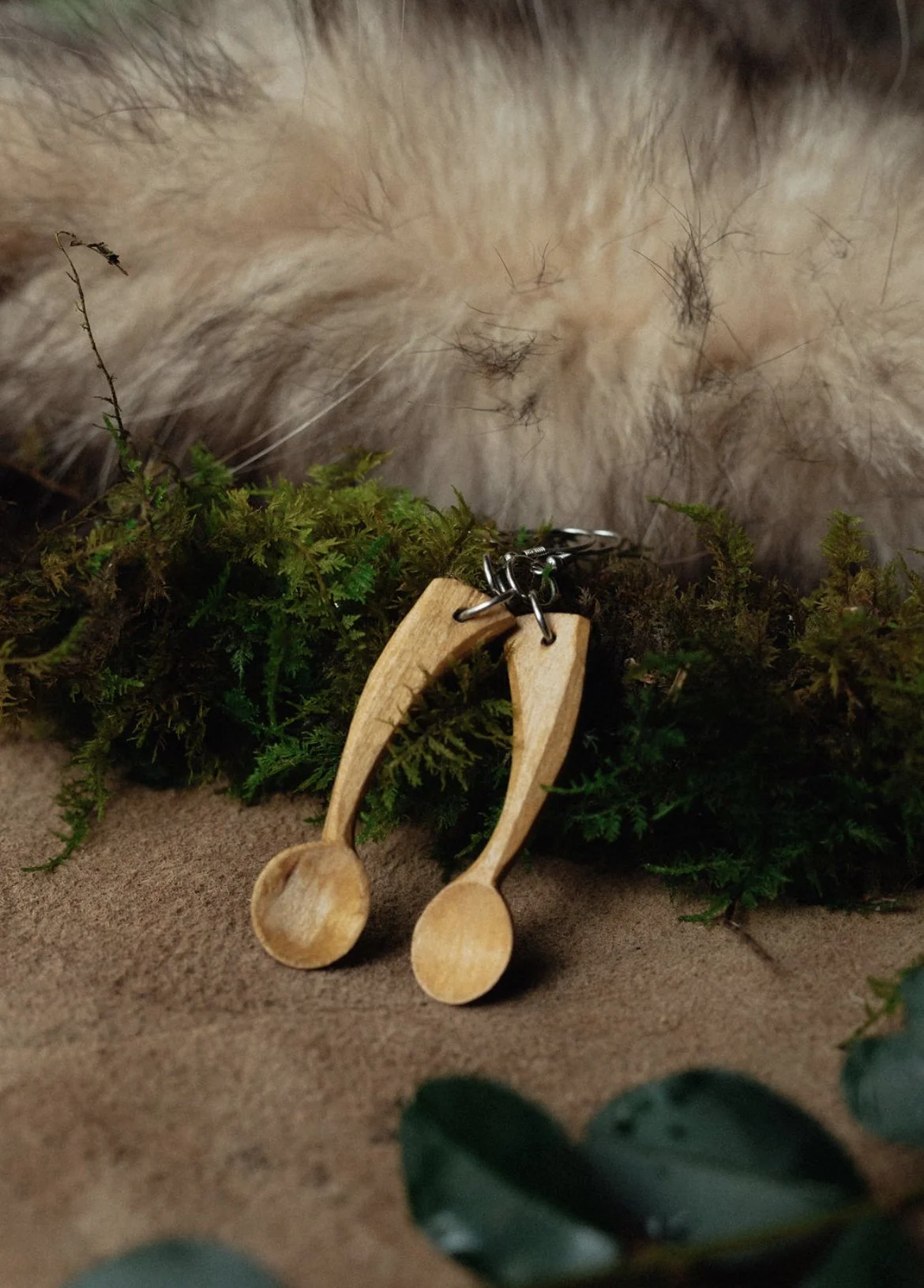 These matching spoon earrings are hand carved from the wood of a paper birch tree.